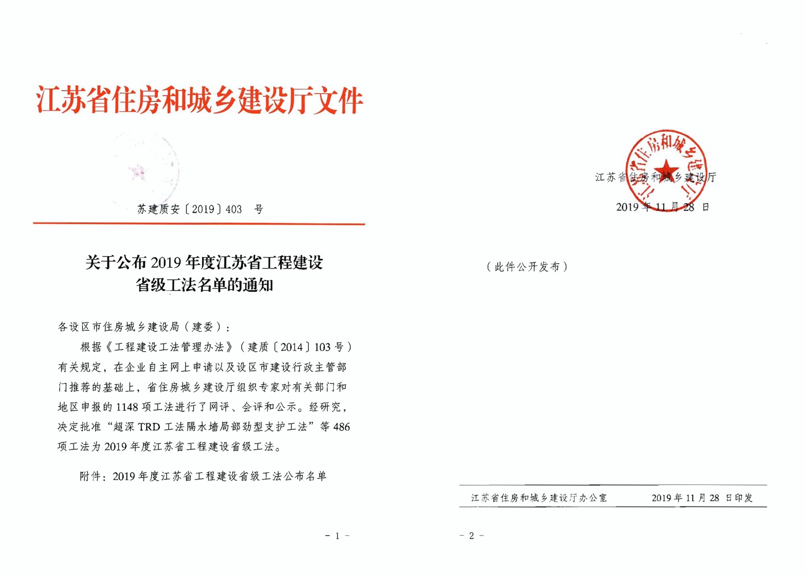 附件:《關(guān)于公布2019年度江蘇省工程建設(shè)省級(jí)工法名單的通知》[ 下載 ]