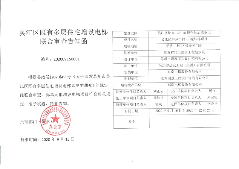 為更好地服務(wù)于吳江區(qū)既有多層住宅增設(shè)電梯工作,根據(jù)《蘇州市吳江區(qū)既有多層住宅增設(shè)電梯實(shí)施意見》及《吳江區(qū)既有多層住宅增設(shè)電梯聯(lián)合審查試行辦法》精神,我司積極響應(yīng)政策要求參與其中。由區(qū)住建局牽頭組織專家小組對參建單位資格等方面進(jìn)行審查、并向社會公示,形成推薦單位,我司成功入圍電梯加裝單位。