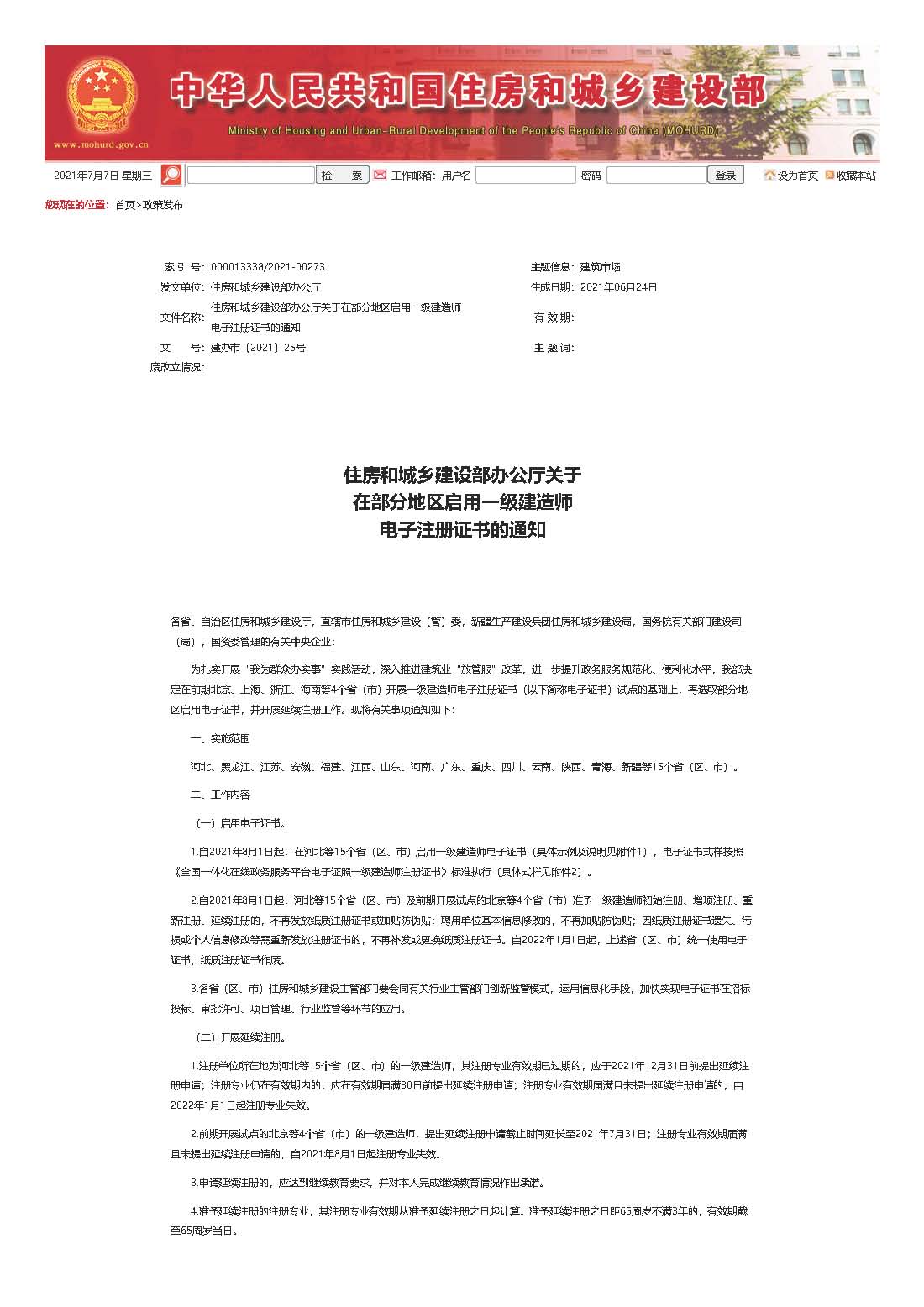 當(dāng)前位置: 首頁 - 新聞資訊 - 行業(yè)動(dòng)態(tài) - 住房和城鄉(xiāng)建設(shè)部辦公廳關(guān)于 在部分地區(qū)啟用一級(jí)建造師 電子注冊證書的通知