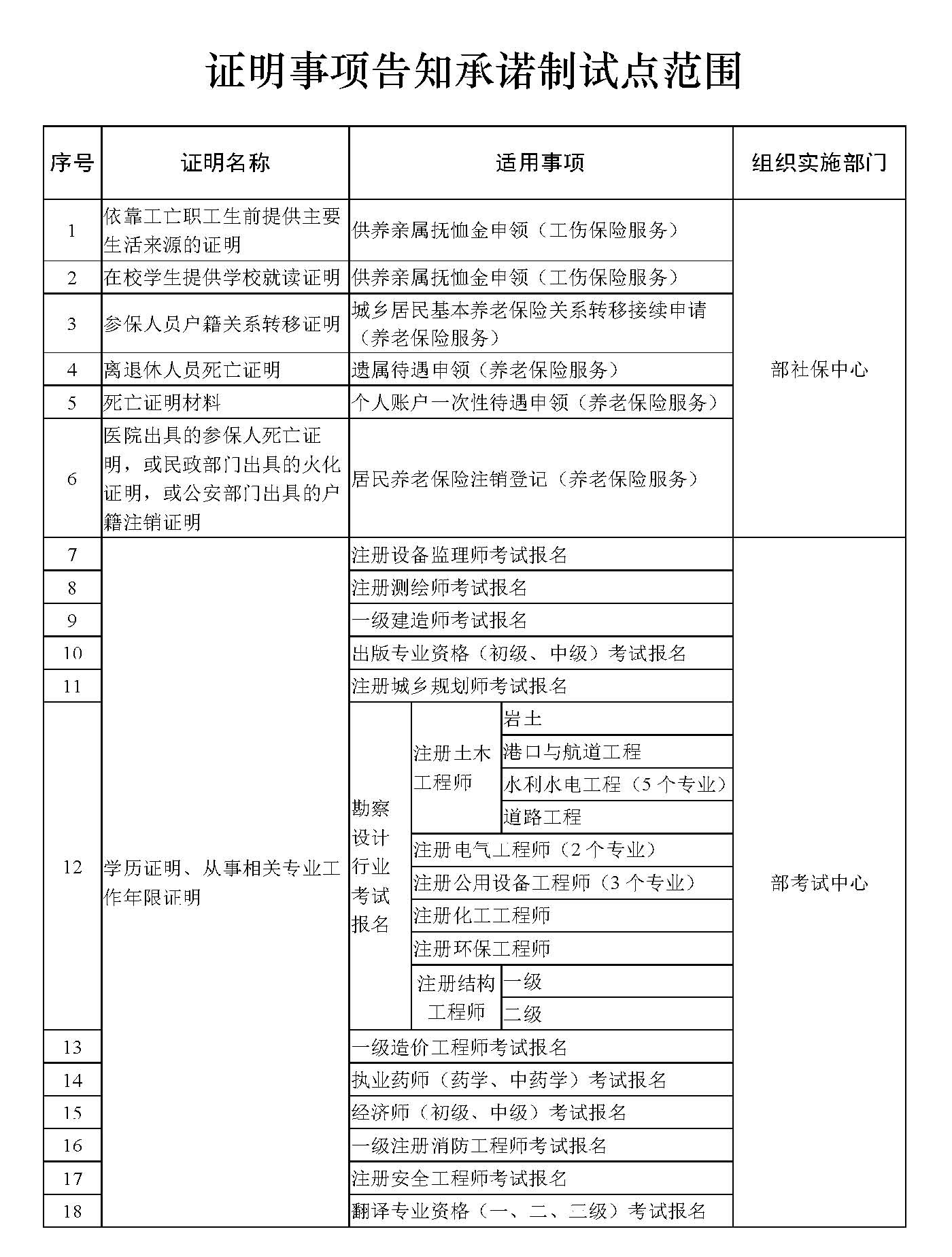 根據(jù)現(xiàn)有工作基礎(chǔ),確定在6項社會保險經(jīng)辦業(yè)務和12項專業(yè)技術(shù)人員資格考試報名中開展證明事項告知承諾制試點(詳見附件)。