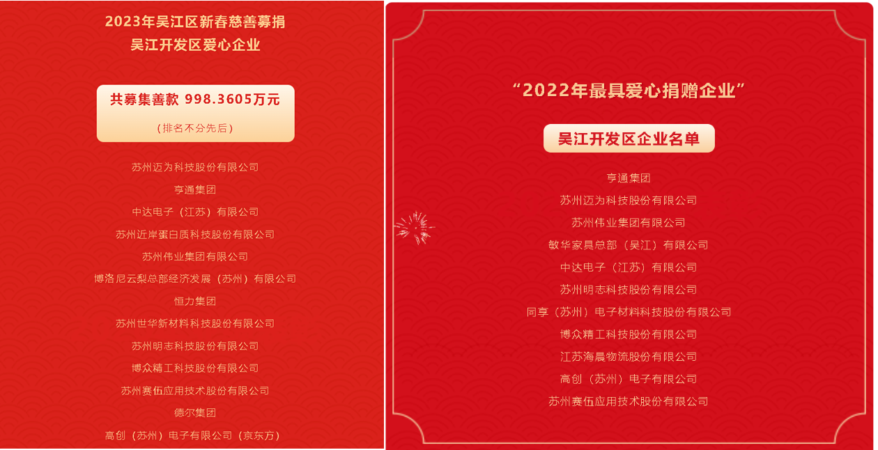 同心協(xié)力,愛心捐贈又一年。2022年12月28日,吳江區(qū)召開設(shè)區(qū)十周年大會暨新春座談會。2012年10月,吳江撤市設(shè)區(qū),全面融入蘇州主城區(qū);2019年11月,吳江全域納入長三角生態(tài)綠色一體化發(fā)展示范區(qū)。開放帶來更多競爭,本地企業(yè)有限市場空間被擠壓,集團(tuán)于夾縫中求生存,克服千難萬難求發(fā)展,勇于創(chuàng)新、勇于奉獻(xiàn),集團(tuán)領(lǐng)導(dǎo)在本次活動中捐款100萬元,企業(yè)被評為“吳江區(qū)2022年最具愛心捐贈企業(yè)”、“2023年吳江區(qū)新春慈善募捐吳江開發(fā)區(qū)愛心企業(yè)”。
